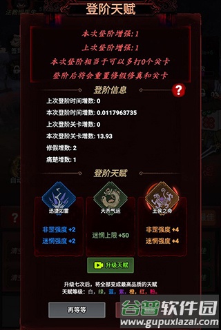 2、若对开局天赋不尽满意,可通过登阶方式重来,再次挑选天赋开启修假之旅。