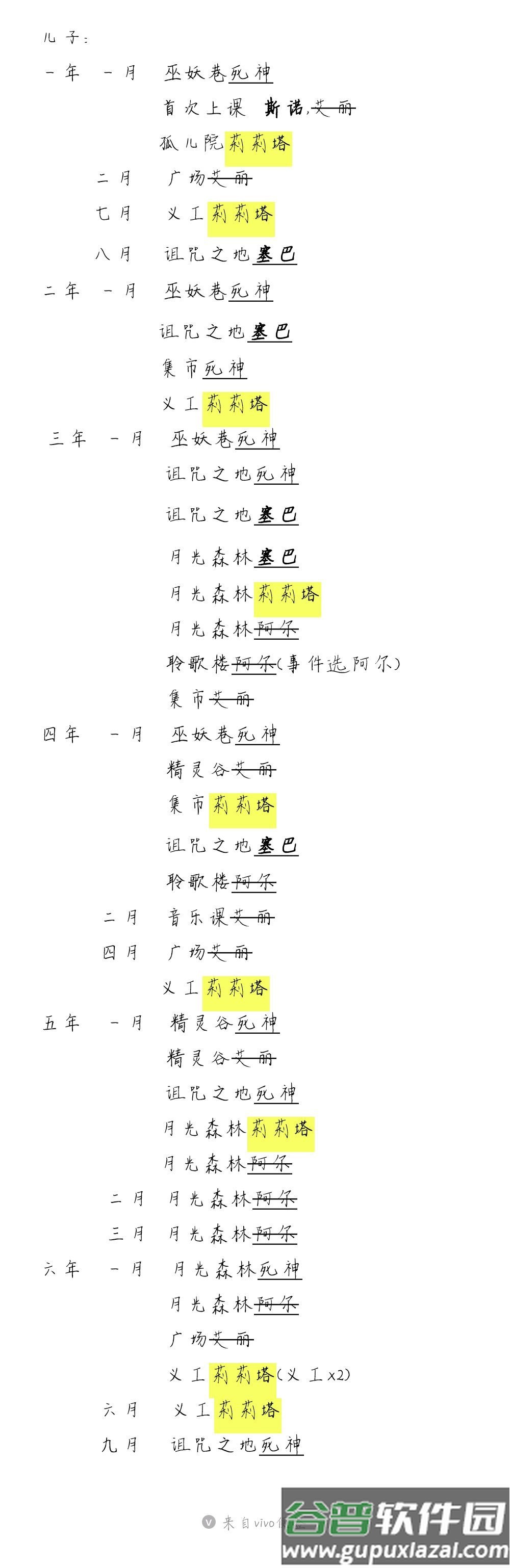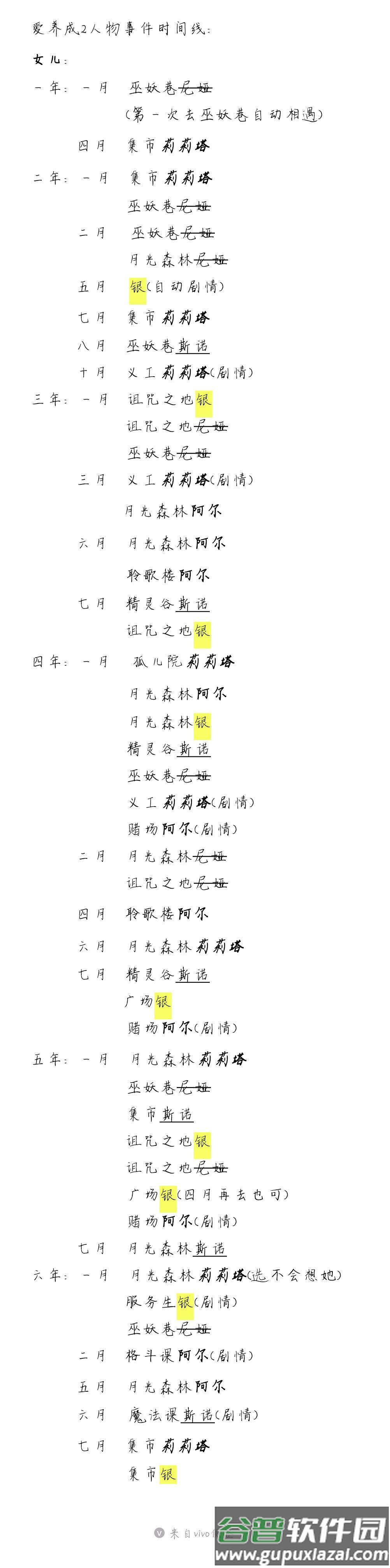 这份攻略按女儿与儿子分别整理,以时间轴为序,列出各年各月在不同地点可能遇到的角色。