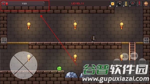 7、屏幕左上角为生命值显示,归零则游戏失败;击倒敌人或破坏容器有机会获得回复药水。