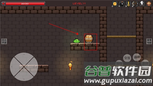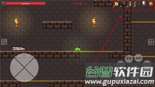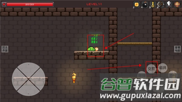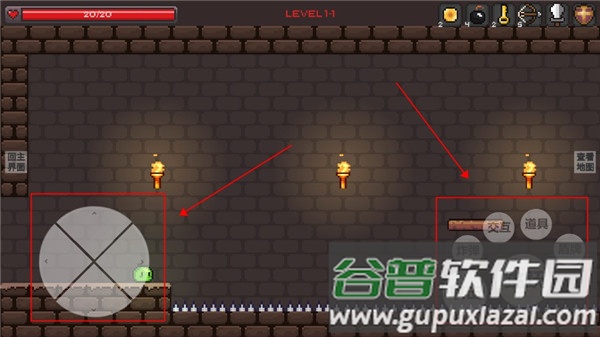 1、左侧虚拟摇杆负责控制角色移动,右侧按键分别对应攻击、跳跃、互动与使用道具功能。