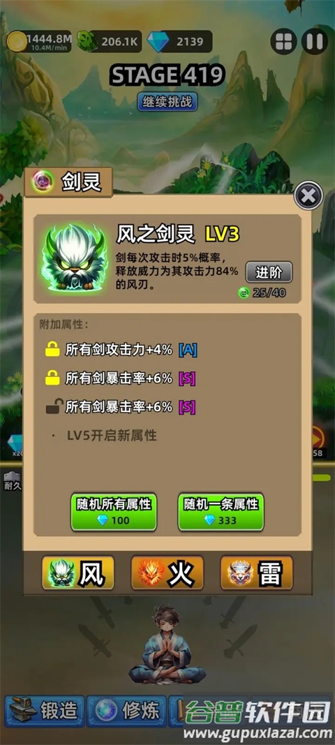 4、剑灵环节:依据自身需求刷新技能,闪避、攻击与移动速度属性建议优先考虑。