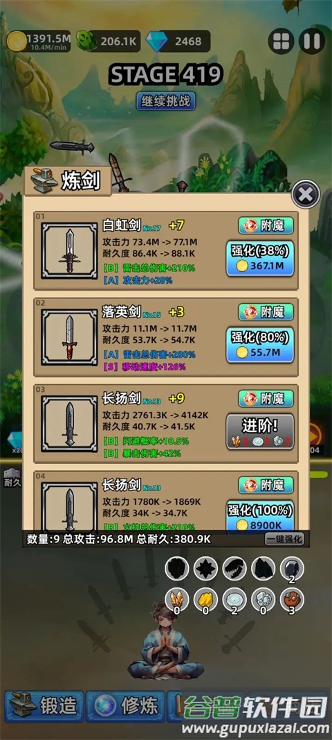 1、炼剑环节:推进关卡时建议集中培养一把剑,挂机时再培养其他剑。当前版本剑的等级直接影响伤害,优先提升主剑能更顺利闯关;若偏好休闲,可均衡培养多把剑用于积累金币,稳步发展。