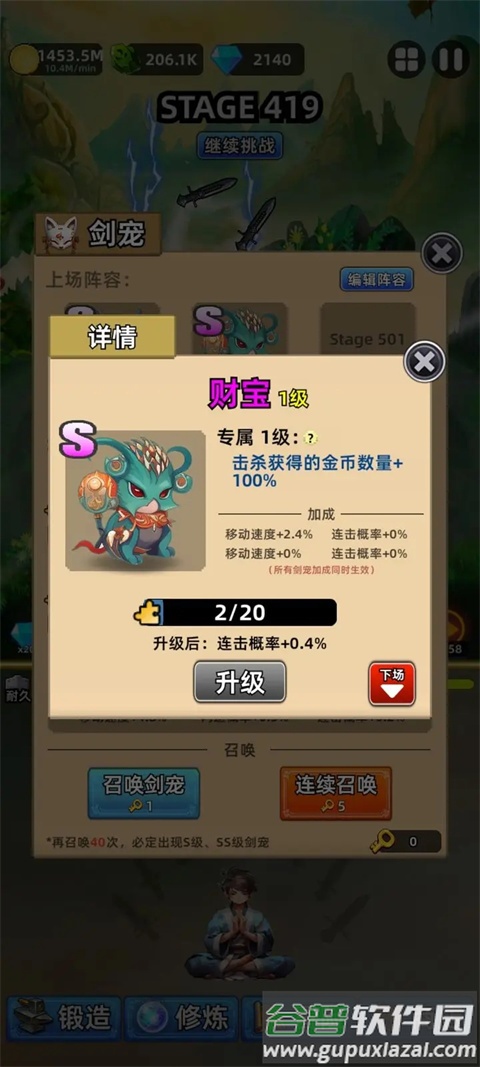 5、剑宠环节:高级剑宠获取存在随机性,但S级财宝宠对金币收获帮助显著;没有也不必强求,通过保底机制积累即可获得。