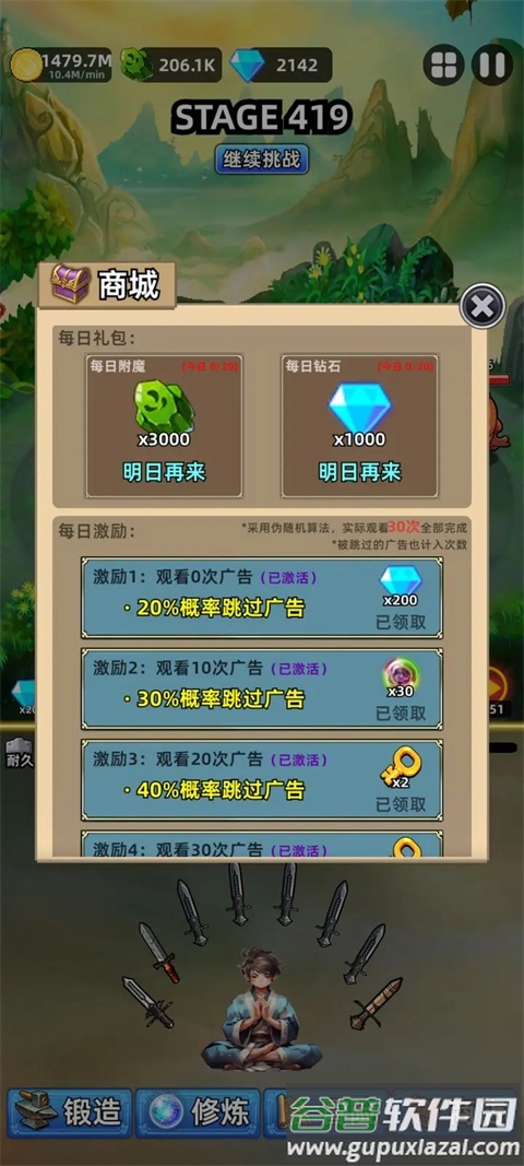 8、商城环节:可通过观看广告获取资源,有精力可多观看以加速成长;也可选择忽略,享受单机放置的悠闲节奏。