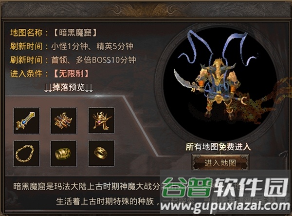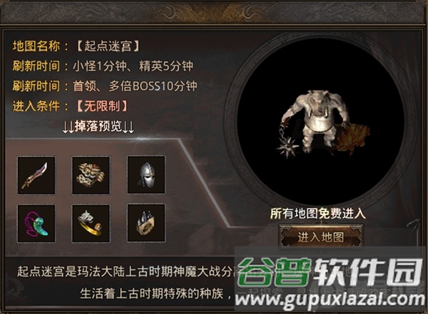 起点迷宫作为新手地图,内有普通怪物、精英怪与BOSS,难度较低容易通过;掉落清风系列装备。