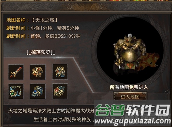 冰域雪原属于初级地图,背景设定为神魔大战后分离的神秘区域;可获取热血系列装备。