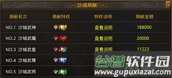 排名依据捐献灵符数量决定,单次最低捐献500灵符,保底名额无上限;当累计捐献达到188000灵符时,无论最终排名如何,均可共享第一名的沙城武神全部属性奖励。