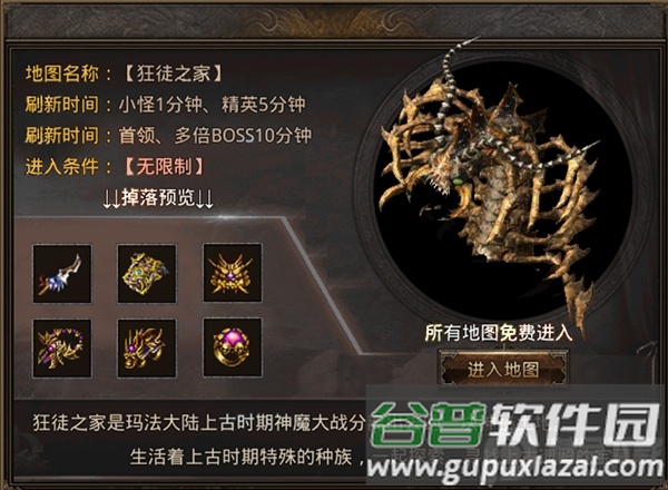 一大陆包含十六张地图,先说明基础的六张:起点迷宫(新手)、冰域雪原(初级)、秦始皇陵(初级)、暗黑魔窟(中级)、狂徒之家(高级)、天地之域(高级)。