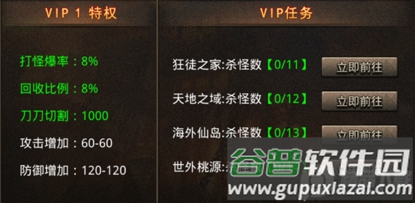 完成任务能提升VIP等级,解锁对应特权;VIP等级越高,获得的额外属性加成就越显著,包括打怪爆率、回收比例、切割伤害、攻击力与防御力等。