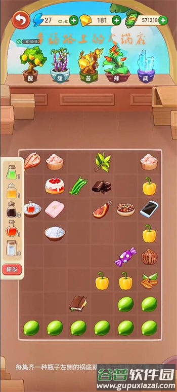 研发火锅底料需在仓库收集果实,通过两两合成最终得到不同颜色的五味瓶,随后在研发界面完成合成;