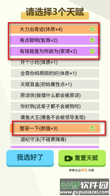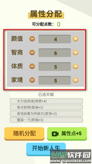 2、建议开局分配:颜值6点,智商4点,体质6点,家境4点。