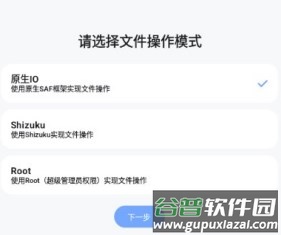 3、根据手机系统情况,从三种文件操作模式中选择一种:原生io模式使用系统框架;Shizuku模式借助Shizuku服务;Root模式需要超级管理员权限;
