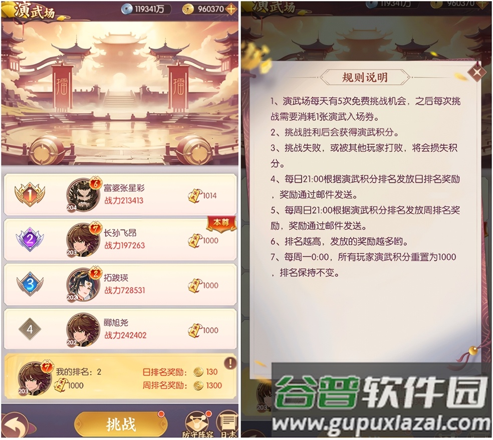 接下来是演武副本。演武:演练武艺,精益求精。该玩法侧重比拼队伍的整体战力,英雄培养程度直接影响胜负结果。演武场是展示实力的舞台,获胜场次越多,排名就越高,每日与每周的奖励也会根据排名发放。请注意,每日免费挑战次数有限,通常为五次,用完后需消耗演武入场券才可继续挑战。