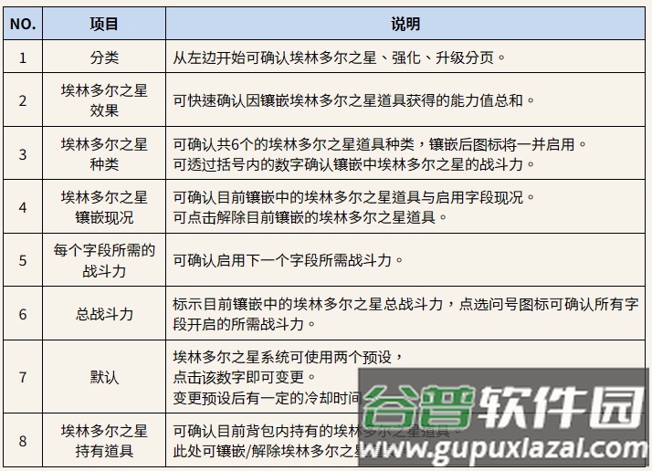 六种埃林多尔之星道具拥有各自独特的属性,通过击败亚特兰斯地区的怪物掉落。系统最多开放六个栏位,根据已镶嵌道具的总战斗力逐步解锁后续栏位。