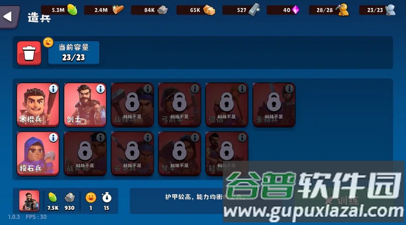 点击地图上的训练场建筑,即可打开士兵制造界面,从中选择你需要的兵种,不同士兵的消耗资源与技能特点各有差异;