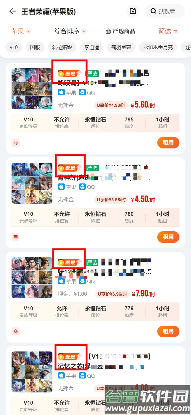 在租号大厅中,商品标题前带有【返现】标签的即为返现商品;也可在筛选条件中直接选择返现商品进行查找。