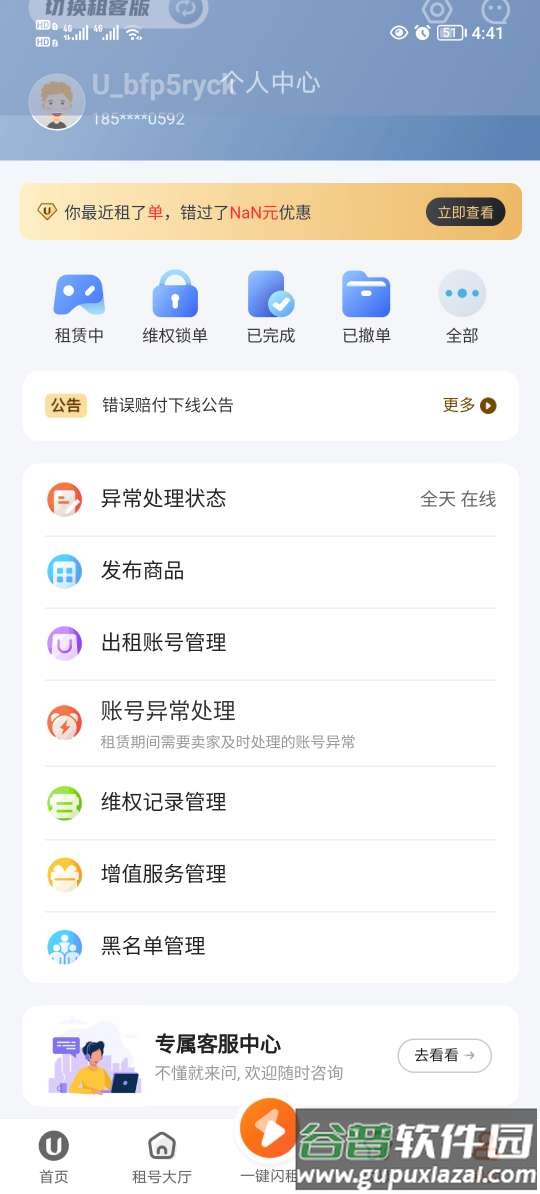 这是一个专注于游戏账号租赁的专业平台,U号租官方客户端为新用户提供注册红包,可用于免费体验游戏。平台配备全天候客服与完善售后体系,服务稳定可靠。账号资源丰富多样,从基础款到高端配置均有覆盖,最低租金仅需零点五元,适应不同玩家的实际需要。