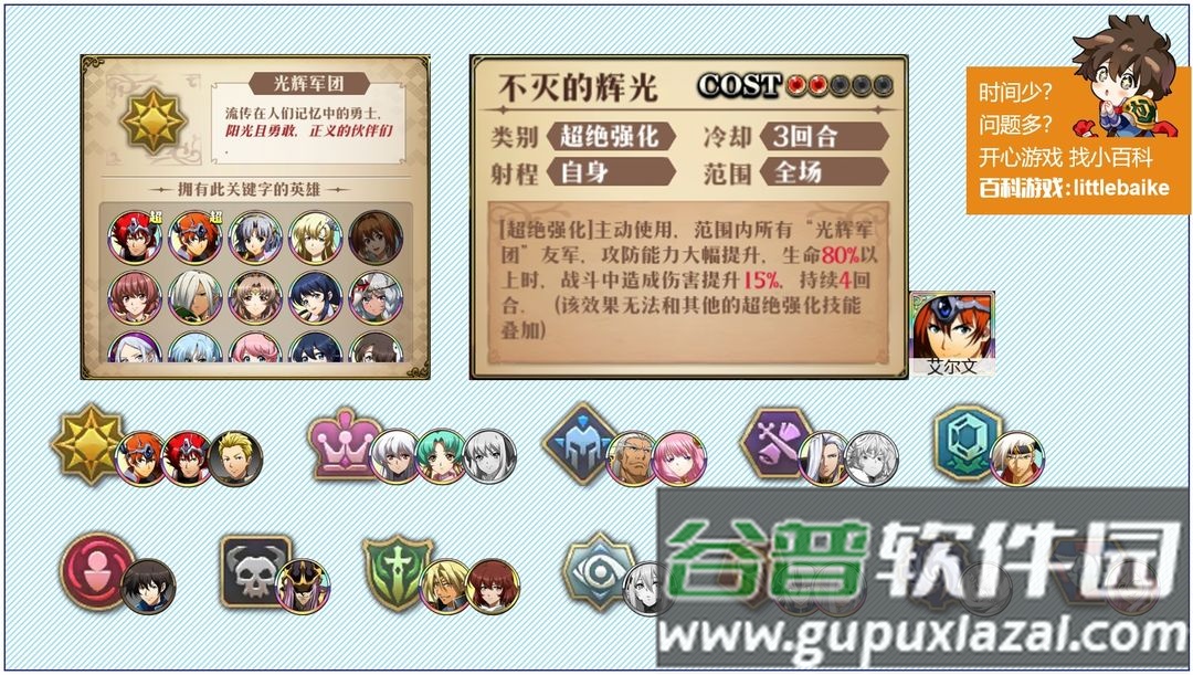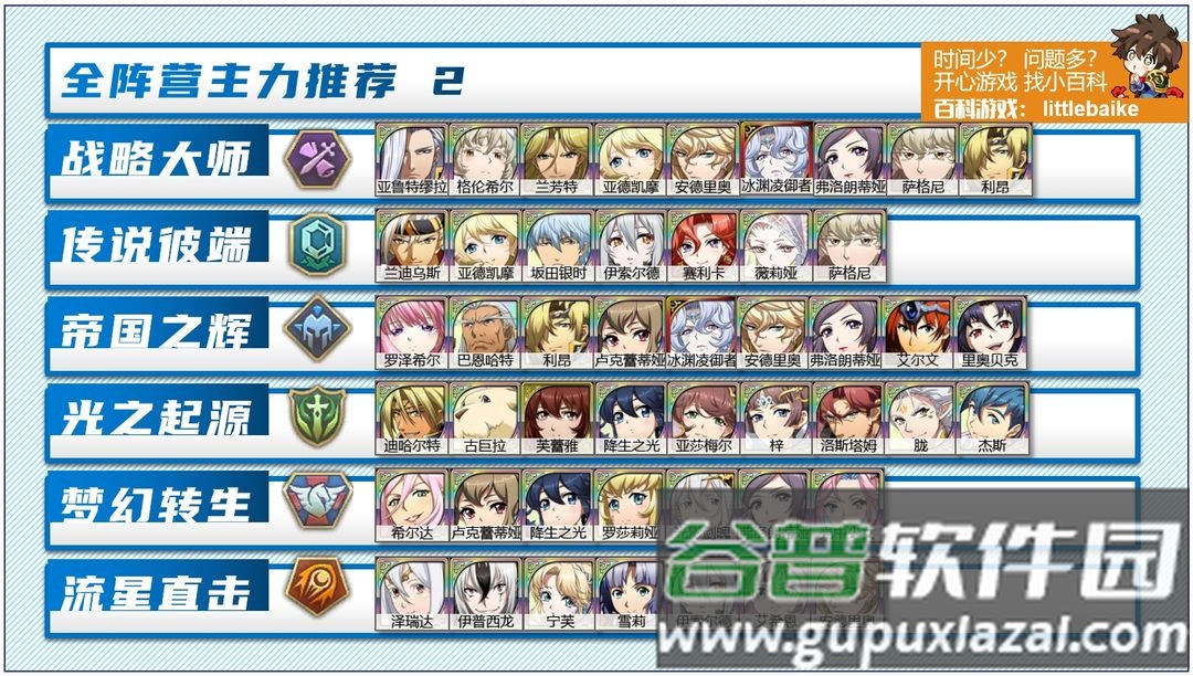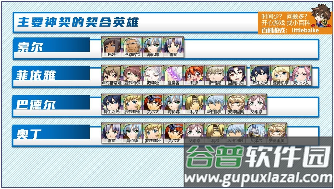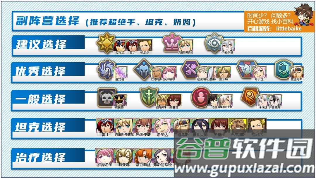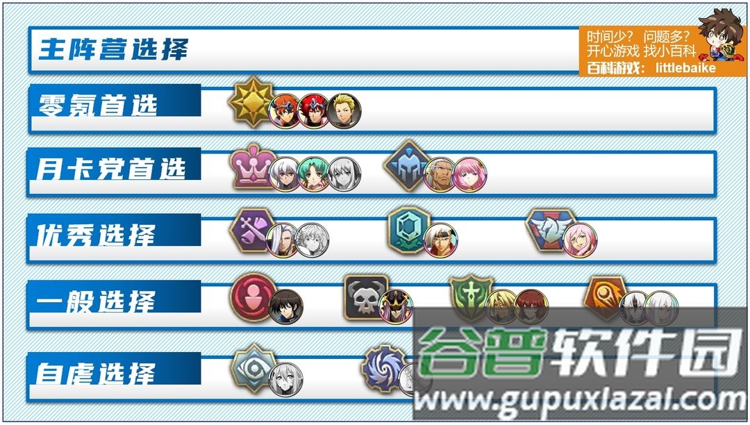 第一,阵营的全面发展,主要用于挑战封印战域等活动。封印战域必须使用纯阵营英雄才能获得成就奖励。前文提到的远古呼唤必须使用UP阵营英雄才容易攻克;时空远征军等活动也有UP阵营机制。因此每个阵营都需要培养,时空阵营除外。每个阵营至少培养一名超绝手,最好还拥有物理输出、魔法输出、坦克和奶妈。