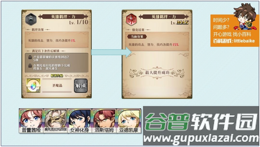 主力阵容成型后,接下来需要抽取羁绊英雄,这是游戏抽卡的一大难点。因为大部分英雄需要其他英雄帮助开启羁绊属性。例如图中奥托克拉托四世能为卢克蕾蒂娅开启攻击羁绊,获得额外基础属性。奥托本身作用不大,也无需培养,但由于卢克蕾蒂娅强度高,玩家往往不得不抽。抽取羁绊英雄时,优先抽取主力输出手的攻击羁绊与坦克的防御羁绊。输出手的防御羁绊、坦克的攻击羁绊以及奶妈的羁绊,可以后期逐步补充。