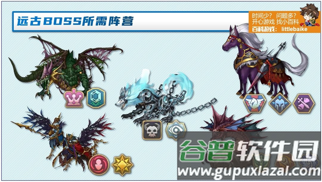 远古的呼唤是强化阵营副本,每个BOSS对应两到三个UP阵营,非UP阵营英雄基本一回合就会全灭。图中列出了每个BOSS对应的阵营,尽量为每个阵营凑齐五名英雄。远古副本也是定期获取资源的重要途径,应尽早攻克,一劳永逸。各阵营主力英雄的选择,将在下个阶段详细说明。