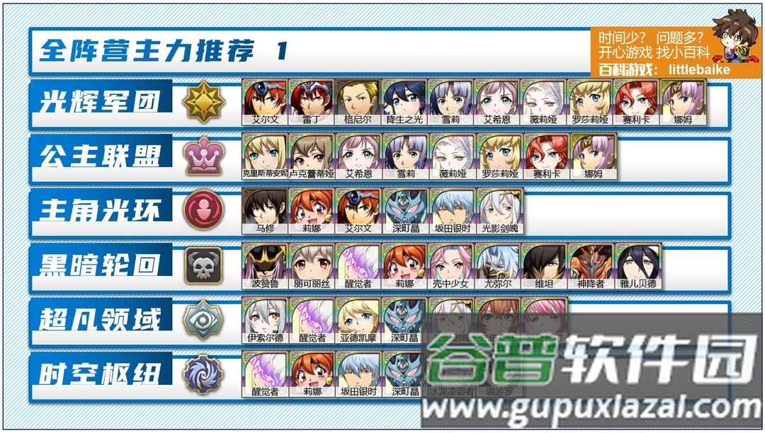 光辉军团必练SP艾尔文;雷丁与格尼尔均可培养,也可练习光佑使徒;降生之光是核心输出,其次是SP雪莉与艾希恩。公主联盟必练花坦克里斯蒂安妮;核心输出是卢克蕾蒂娅、SP雪莉与艾希恩。主角阵营练习马修即可,较缺法师,若没有莉娜,培养蕾伽尔也不错。黑暗阵营优先培养波赞鲁,后期补充丽可丽丝也较强;缺点是物理英雄与坦克较少。超凡阵营在拥有龙妈伊索尔德后强度极高。时空阵营可以不练,因为封印战域中没有该阵营,但醒觉者必练。
