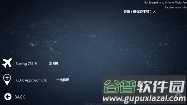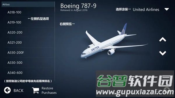 1、飞机选择:点击飞机图标进入机型库,绿色箭头表示可下载机型,点击下方…free Dow…获取,Back键返回;