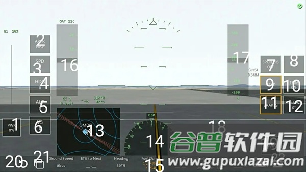 2、界面左侧显示速度,右侧显示高度,PWR为油门推杆,起飞时上推,降落后下拉;