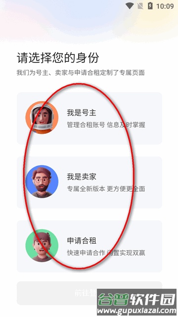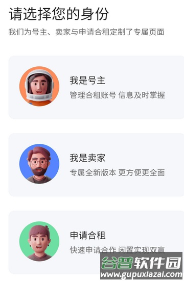 3、选择您的身份,软件为号主、卖家和申请合租用户分别设置了专属页面。