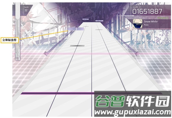 游戏界面设有上下两条判定线。扁平状的短音符需要在与下方判定线重合时点击;立体状的短音符则需在与上方判定线重合时点击。