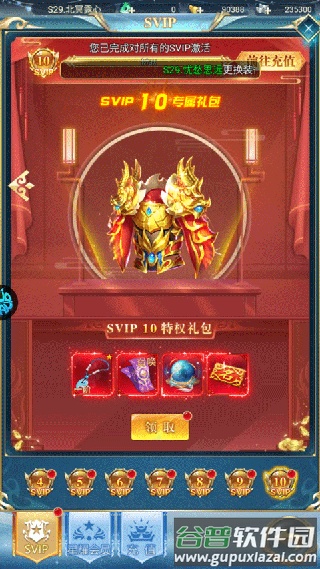 2、上线即送VIP10等级,可在VIP界面免费领取1至10级的所有对应奖励。