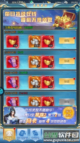 3、累计每日在线时长,可领取元宝与召唤券等资源。