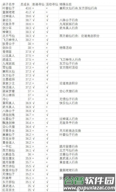 首先附上一张图表,列出了当前可通过各种方式获取的弟子及其数据。