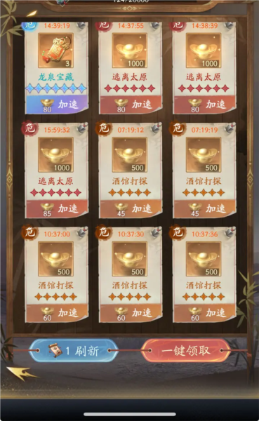 悬赏任务从开服第二天或第三天起,尽量只接取金色、红色与紫色任务;因初期免费刷新次数较多,无需担心元宝浪费;红色与金色任务奖励更高,并能快速提升悬赏等级。