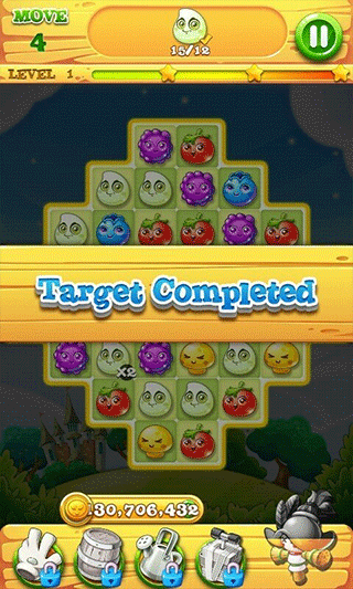 3、在移动步数耗尽前,收集各类可爱的农作物以达成关卡目标;