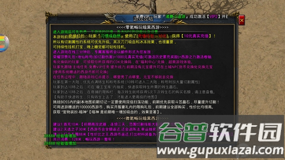 建议3:打金专属88米,性价比极高,西游币返还,打出的材料装备不绑定,附送群体切割神技灭世之剑;总计消费128米,可畅玩整年。