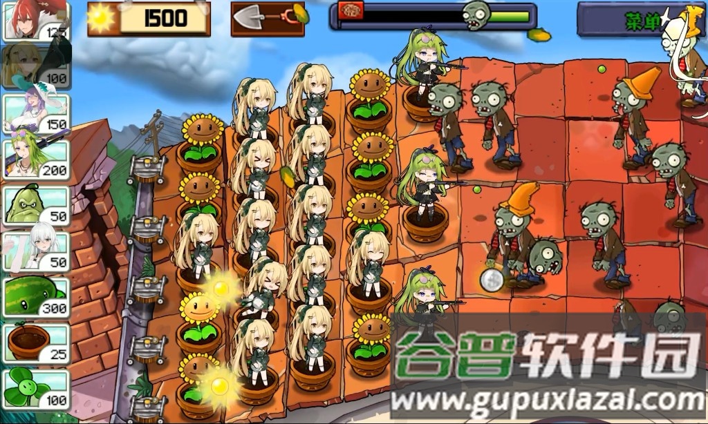 4、种植蘑菇收集阳光,布置植物娘阵型,抵御僵尸进攻。