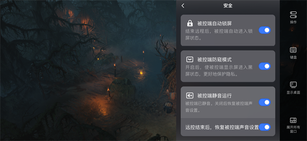 远程连接到受控设备后,点击侧边工具栏中的[操作]选项,进入[安全]设置菜单,即可找到并切换[被控端防窥模式]的开启或关闭状态。