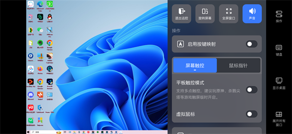 成功进入远程桌面后,可将手机屏幕旋转以获得更好视野;通过侧边弹出的工具栏,可以进行一系列功能配置,例如切换[操作]模式、调出[键盘]、快速[显示桌面]或[展示所有窗口]等。