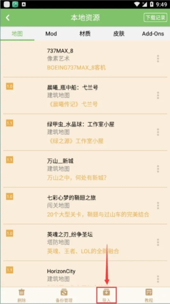 2、以导入地图为例,在地图分类底部找到并点击导入按钮;