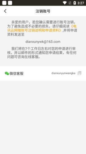 3. 随后界面会显示注销注意事项,需将账号信息发送给指定微信客服等待处理。