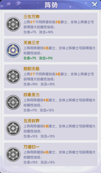 上阵不同阵营与数量的修士,可获得对应的属性加成,选择培养修士时可参考此加成。