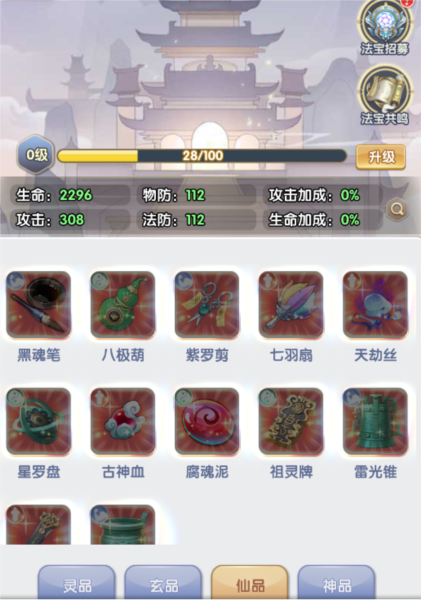 角色等级达到25级开启藏宝阁玩法,仅六星及以上修士可穿戴法宝,星级越高解锁的法宝孔位越多;消耗同名法宝或低品法宝可进行升星,增强穿戴效果;法宝效果与属性加成仅在战斗中生效。