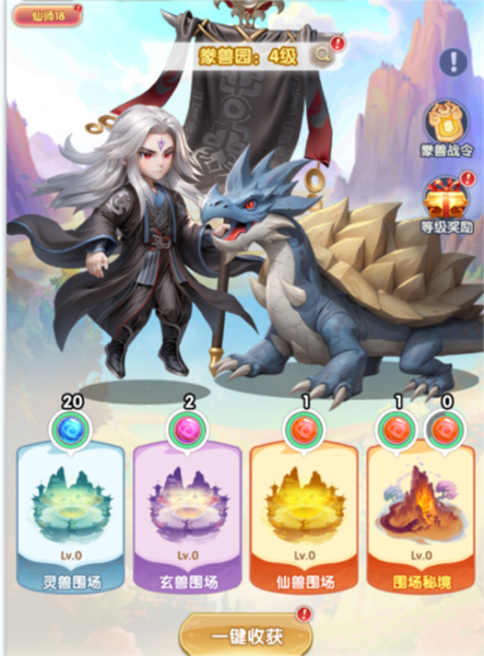 豢兽园的围场产出灵兽之粮,用于灵兽进阶;提升围场等级可增加灵气值与产出效率,提升豢兽园等级可获得等级奖励,并解锁更高围场等级;注意围场产出有存储上限,请及时领取。