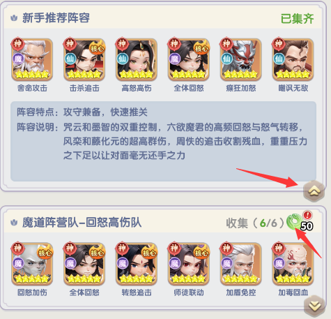 修士界面左上角设有攻略入口,点击可查看各类推荐阵容;点击阵容下拉按钮,能展示其特点与说明,帮助新手快速理解布阵思路;集齐推荐阵容中的修士可领取仙玉奖励,收集数量越多奖励越丰厚。