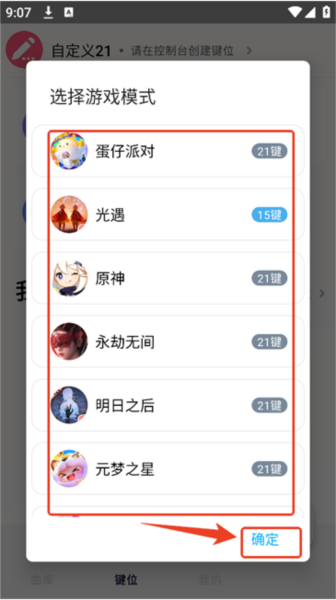 找到目标游戏并确定,然后在键位布局中选择合适的类型。