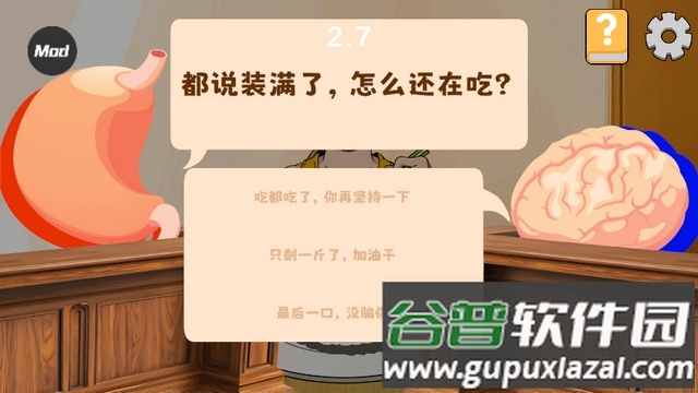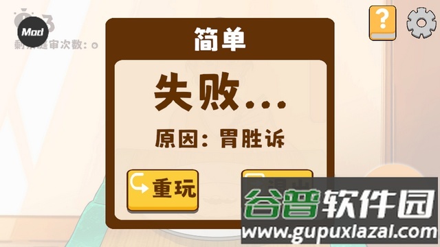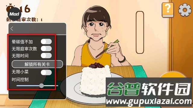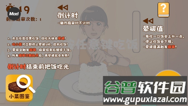 触发庭审后,需完成庭审流程才可继续游戏;若所有庭审次数用尽后再次晕碳,则挑战直接失败;核心目标是在规定时间内吃完所有米饭。