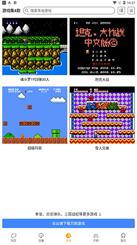 2、菜单栏中心为本地游戏区,软件预置多款街机游戏,大部分支持在线直接运行;下载到本地可重复游玩且占用空间较小。