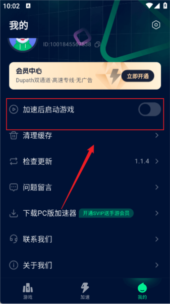 3、加速扫描后前往个人中心找到加速后自动启动游戏,打开开关即可