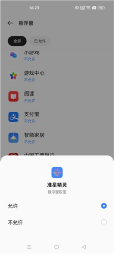 2、若提示无悬浮窗权限,按指引开启该应用的悬浮窗权限即可。