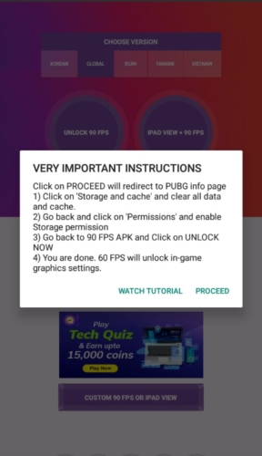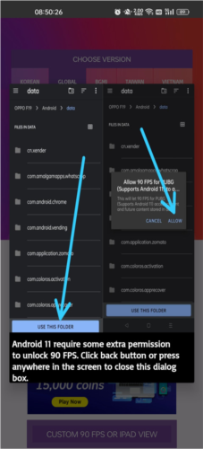 1) 在运行安卓11以下版本的设备上解锁90 FPS,只需允许权限并点击解锁90 fps按钮。